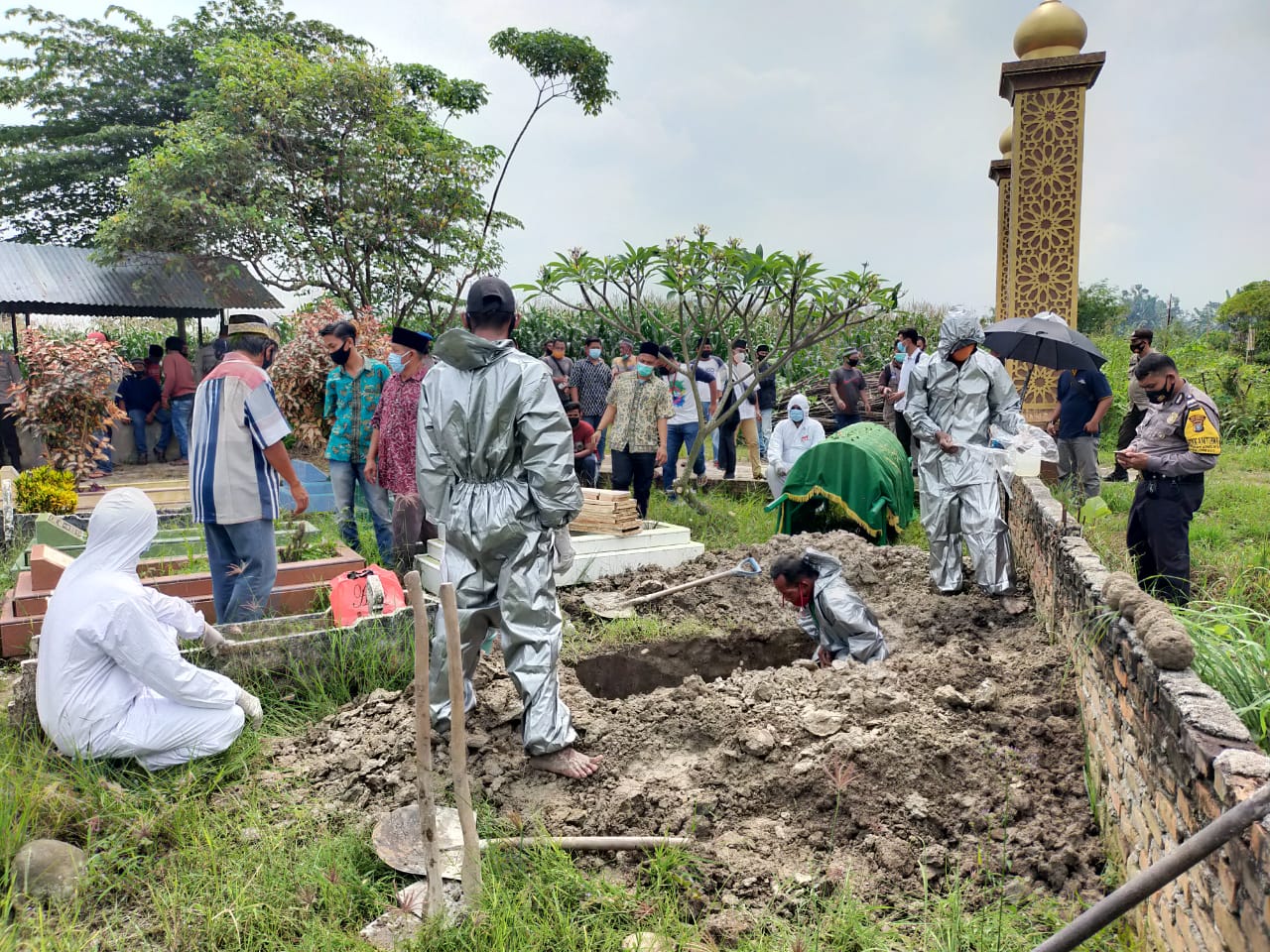 Sementara, sekitar pukul 11.00 WIB tadi, jenazah istri Kades dikebuminkan di TPU Muslim Desa Bakaranbatu dengan tata cara penanganan Covid-19. Petugas pemakaman juga terlihat menggunakan alat pelindung diri (APD).
