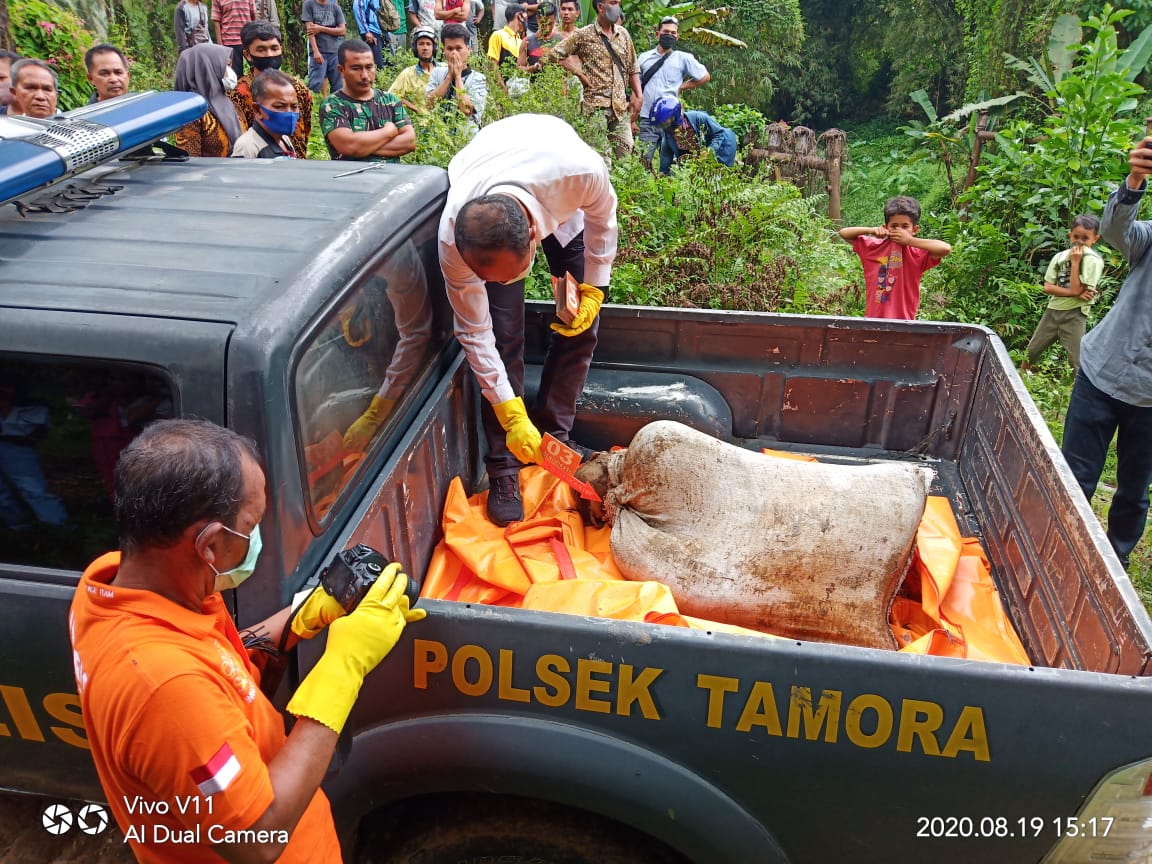 Proses evakuasi jenazah korban yang ditemukan terbungkus karung dan mengambang di Sungai Permina/foto : nyak BICARAINDONESIA-Deliserdang : Teka-teka identitas mayat dalam karung putih ukuran 50 kilogram yang ditemukan mengambang di Sungai Permina, Kebun London Sumatera (Lonsum), Dusun V, Desa Sei Merah, Kec. Tanjungmorawa, Kab. Deliserdang, Sumatera Utara pada Rabu, 19 Agustus 2020 lalu, akhirnya terkuak.