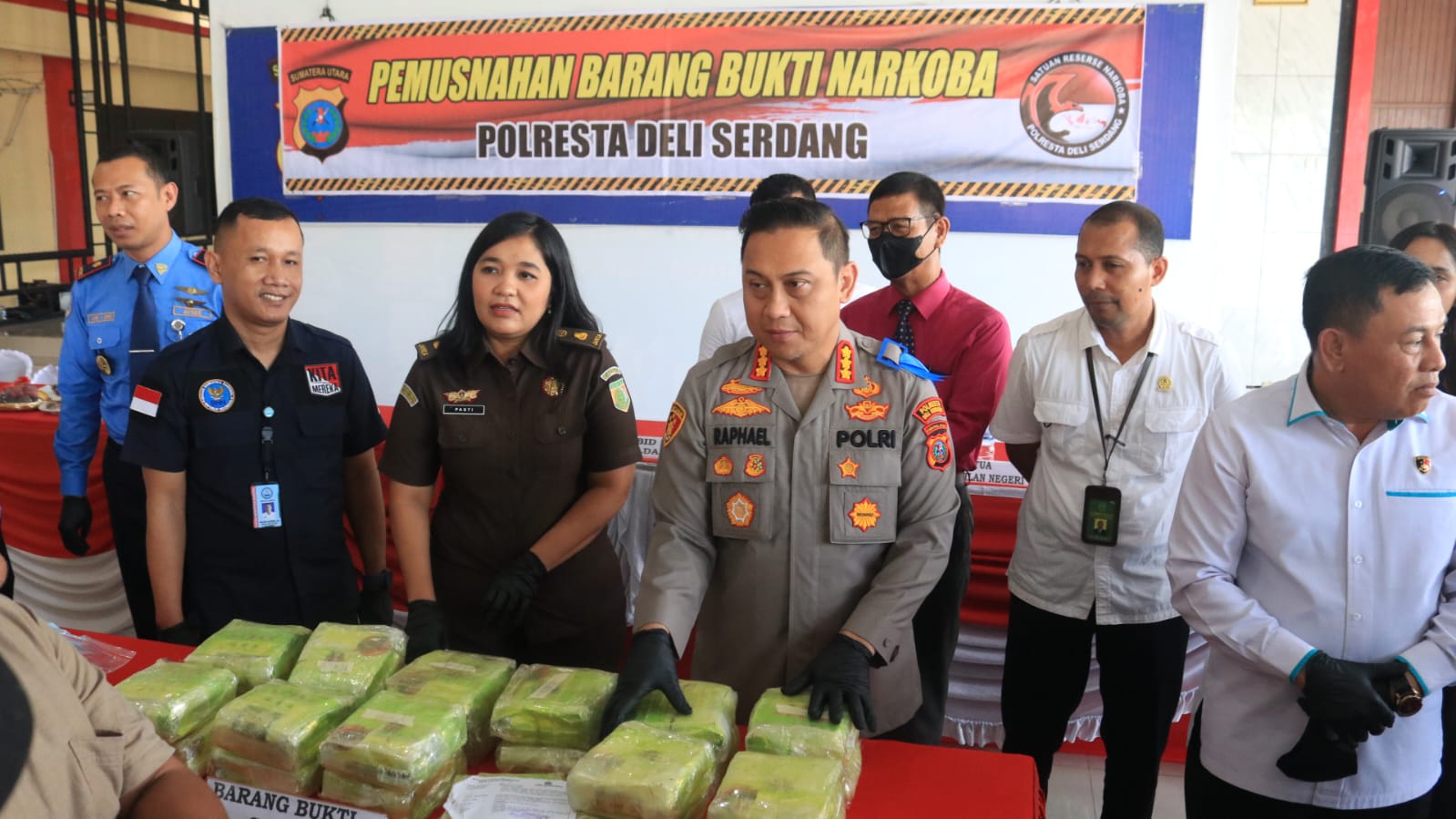 Hal tersebut diungkapkan Kapolresta Deliserdang Kombes Raphael Sandhy Cahya Priambodo, SIK dalam konferensi pers di Aula terbuka Mapolresta yang dihadiri BNN Propinsi, Pengadilan Negeri Lubuk Pakam, Kejaksaan Negeri Deliswrdang, BNN Kabupaten Deliserdang, laboratorium forensik (Labfor) cabang Sumatera Utara, Dinas Kesehatan Avsec Bandara KNIA serta pejabat utama Polresta Deli Serdang.
