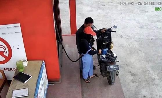 Setelah memarkirkan sepeda motornya di depan alat pengisian BBM, pelaku turun untuk membuka jok sepeda motornya. Pelaku yang mengenakan jaket hitam itu awalnya berdiri di sebelah kanan korban, namun kemudian pelaku berpindah ke sebelah kiri korban.