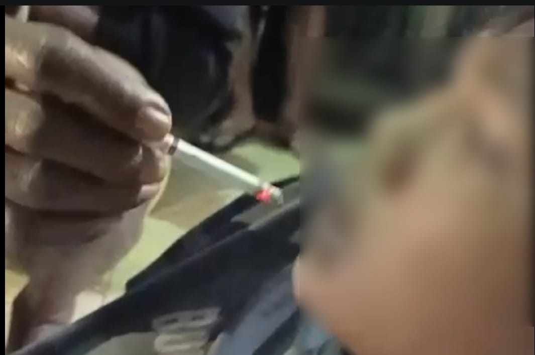 Potongan video viral saat seorang warga mengancam akan menyundut dengan rokok mulut bocah di Madina yang dituduh curi rokok/foto : ist BICARAINDONESIA-Madina : Keji! Begitulah kira-kira gambaran dalam video yang viral, saat sejumlah warga menganiaya seorang anak di bawah umur. Tidak itu saja, mulut bocah tersebut juga diancam akan disundut rokok yang menyala, sambil terus diinterogasi.