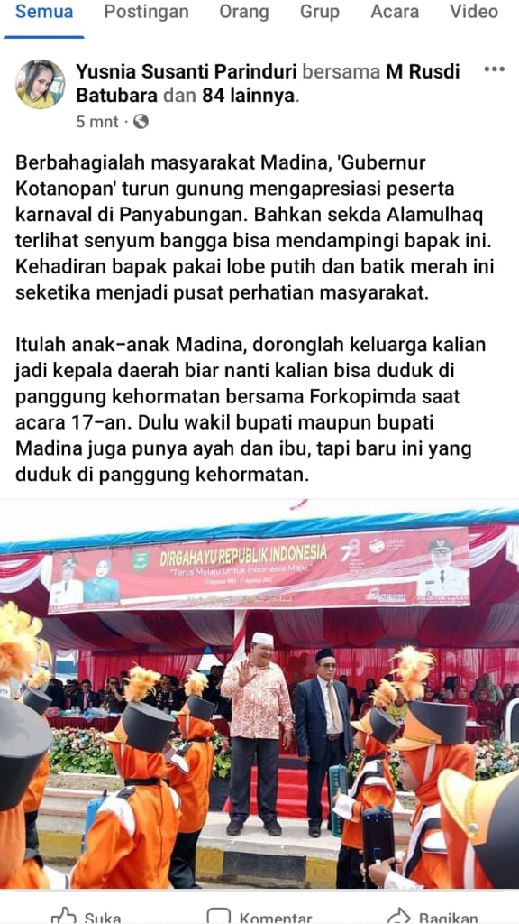 Wadih Al Rasyid salah satunya. Founder Madina Care Institut ini menulis ulasan tentang foto ayah Wakil Bupati Madina Atika Azmi Utami yang tampak tampil di panggung kehormatan karnaval budaya bersama Forkopimda.